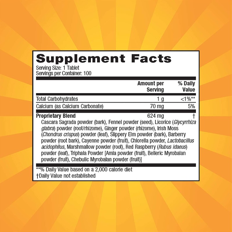 - 14 HERB PROPRIETY BLEND - 624 mg Cascara Sagrada powder, Fennel powder, Licorice (Glycyrrhiza glabra) powder, Ginger powder (rhizome), Irish Moss (Chondrus crispus) powder (leaf), Slippery Elm powder (bark), Barberry powder (root bark), Cayenne powder (fruit), Chlorella powder, Lactobacillus acidophilus, Marshmallow powder (root), Red Raspberry (Rubus idaeus) powder (leaf), Triphala Powder [Amla powder (fruit), Belleric Myrobalan powder (fruit), Chebulic Myrobalan powder.