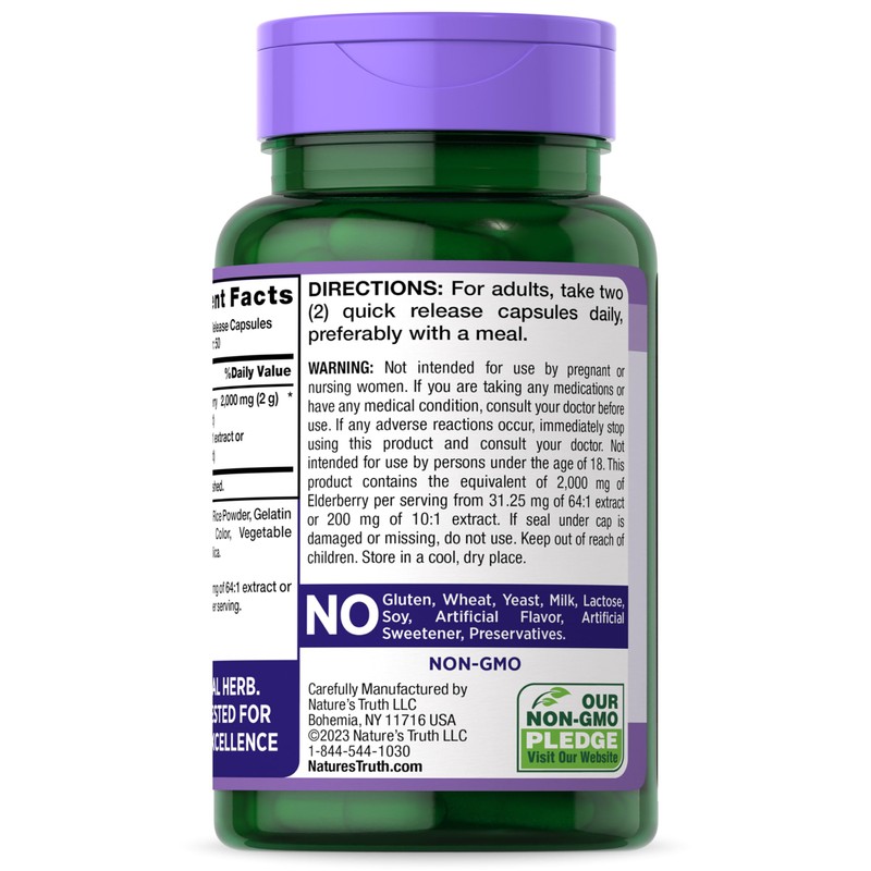 Nature’s Truth: Where Wellness BeginsOur mission at Nature’s Truth is to meet your wellness needs with products that go above and beyond. Nature’s Truth provides supplements in various delivery forms, such as capsules, softgels, chewables, tablets, powders, liquids, and gummies to suit every preference. Our Black Elderberry is non-GMO and free of gluten, wheat, yeast, milk, lactose, soy, artificial flavor, artificial sweetener, and preservatives.
