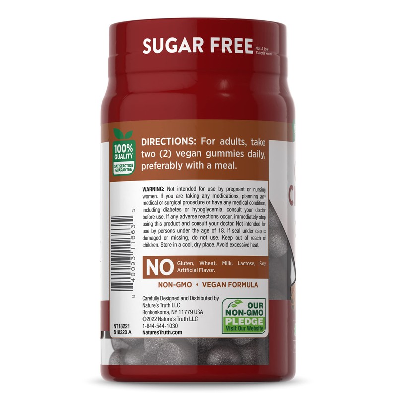 The active ingredient in Ceylon Cinnamon, cinnamaldehyde, contains naturally occurring antioxidant properties. Nature’s Truth Ceylon Cinnamon Gummies are vegan friendly and enhanced with 100 mcg of the important mineral Chromium for additional support.