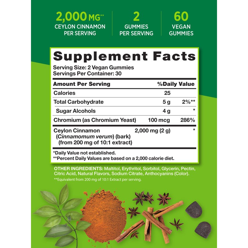 - CEYLON CINNAMON GUMMIES: Equivalent to 2000mg of Ceylon Cinnamon per serving