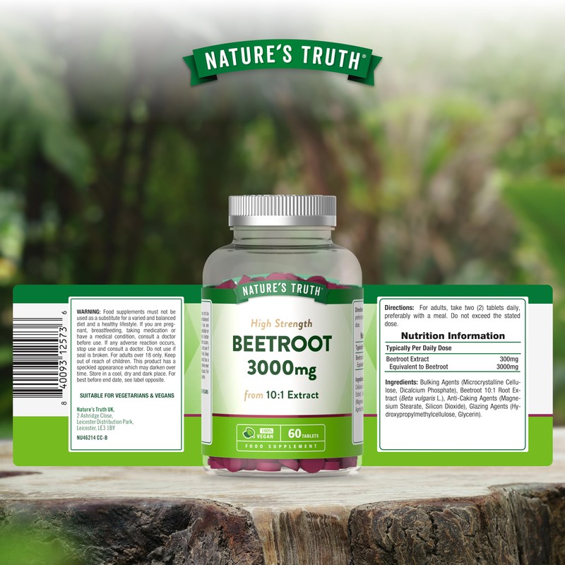 Product descriptionBeetroot (Beta Vulgaris) is a root vegetable that is packed with essential nutrients, fibre and many plant compounds. Beetroot and beetroot juice have now been associated with numerous health benefits. Some people call beets a superfood because they are rich in essential nutrients. It's been particularly popular among athletic people and nutrition enthusiasts for its well-known wellness properties.Nature's Truth Beetroot:Our high strength Beetroot tablets are packed with 3000mg of Beetroot as a 10:1 extract per daily dosage. Simply take two (2) tablets morning or night with a drink of your choice and reap the benefits of this natural supplement.Nature's Truth: Where Wellness BeginsOur mission at Nature's Truth is to meet your wellness needs with products that go above and beyond. Nature's Truth provides supplements in various delivery forms, such as capsules, softgels, chewables, tablets, powders, liquids, and gummies to suit every preference.IngredientsBulking Agents (Microcrystalline Cellulose, Dicalcium Phosphate), Beetroot 10:1 Root Extract (Beta vulgaris L.), Anti-Caking Agents (Magnesium Stearate, Silicon Dioxide), Glazing Agents (Hydroxypropylmethylcellulose, Glycerin).DirectionsFor adults, take two (2) tablets daily, preferably with a meal. Do not exceed the stated dose.Legal DisclaimerFood supplements must not be used as a substitute for a varied and balanced diet and a healthy lifestyle. If you are pregnant, breastfeeding, taking medication or have a medical condition, consult a doctor before use. If any adverse reaction occurs, stop use and consult a doctor. Do not use if seal is broken. For adults over 18 only, keep out of reach of children. Store in a cool, dry and dark place.