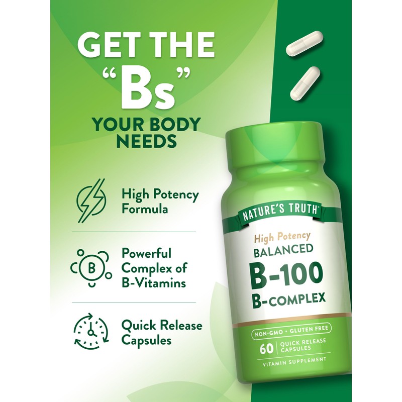 Supplementing with B-Vitamins:There are eight B vitamins collectively called B complex vitamins. This includes thiamine (B-1), riboflavin (B-2), niacin (B-3), pantothenic acid (B-5), pyridoxine (B-6), biotin (B-7), folate (B-9) and cobalamin (B-12). B Vitamins are naturally present in foods like Whole Grains, Red Meat and Dairy; however, many people turn to supplements as an additional source of support.How to get B-Vitamins:B-Vitamins are typically found in products such as Pills, Gummies, Liquid, Powder and Chewable Tablets. A valuable B-Vitamin Complex comes from a professional source backed by years of experience and expertise. Why choose Nature's Truth's Vitamins?Nature's Truth's B-Complex:Nature's Truth High Potency Balanced B-100 B-Complex contains a synergistic blend of Essential B Vitamins such as Thiamin, Riboflavin, Niacin and more. These potent Quick-Release capsules make it easier than ever to get all the amazing benefits B Vitamins have to offer. Purity and potency are our top priorities at Nature's Truth, which is why our formula is Non-GMO, Gluten-Free and contains no Artificial Flavor, Sweetener or Preservatives.