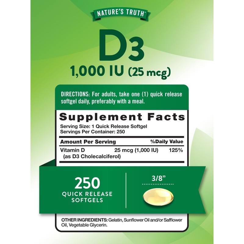 Nature's Truth D3 1000 IU | 250 Softgels | Essential Vitamin D | Non-GMO & Gluten Free Supplement