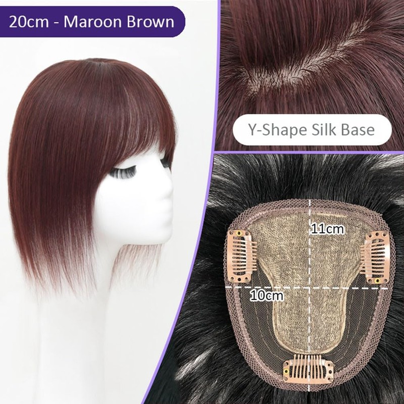 Nature Straight Human Hair Topper Y-Shape 10x11cm Silk Base Clip in Head Top Hairpiece With Wispy Bangs Middle Part Wiglet for Women (20cm Maroon Brown)
