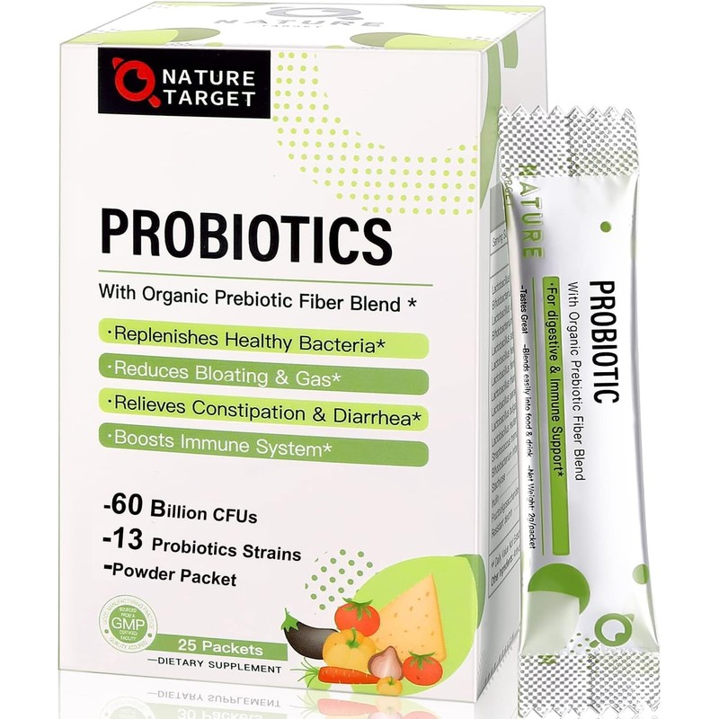 NATURE TARGET Probiotic Powder – 60 Billion CFUs, 13 Strains with Prebiotics for Digestive Health – Shelf-Stable, Non-GMO, Gluten-Free – 30 Packets for Women, Men, and Kids