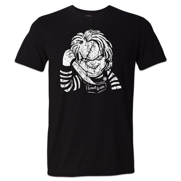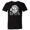 - This T-shirt features a bold graphic of Chucky, the infamous killer doll. The design captures his mischievous grin and blade of choice. The distressed print slays on classic black, making it a striking statement piece. Perfect for fans of the Charles Lee Ray, this T-shirt blends nostalgia with a touch of playful spookiness.