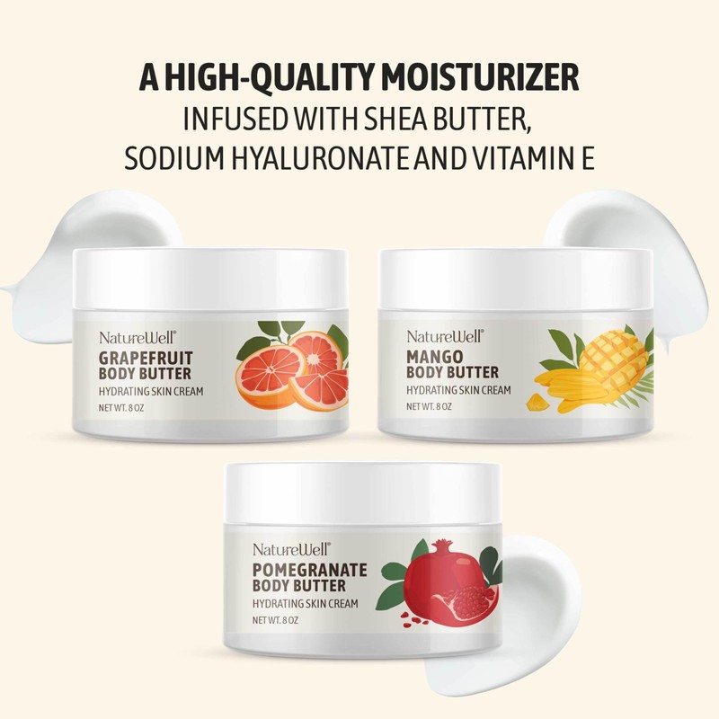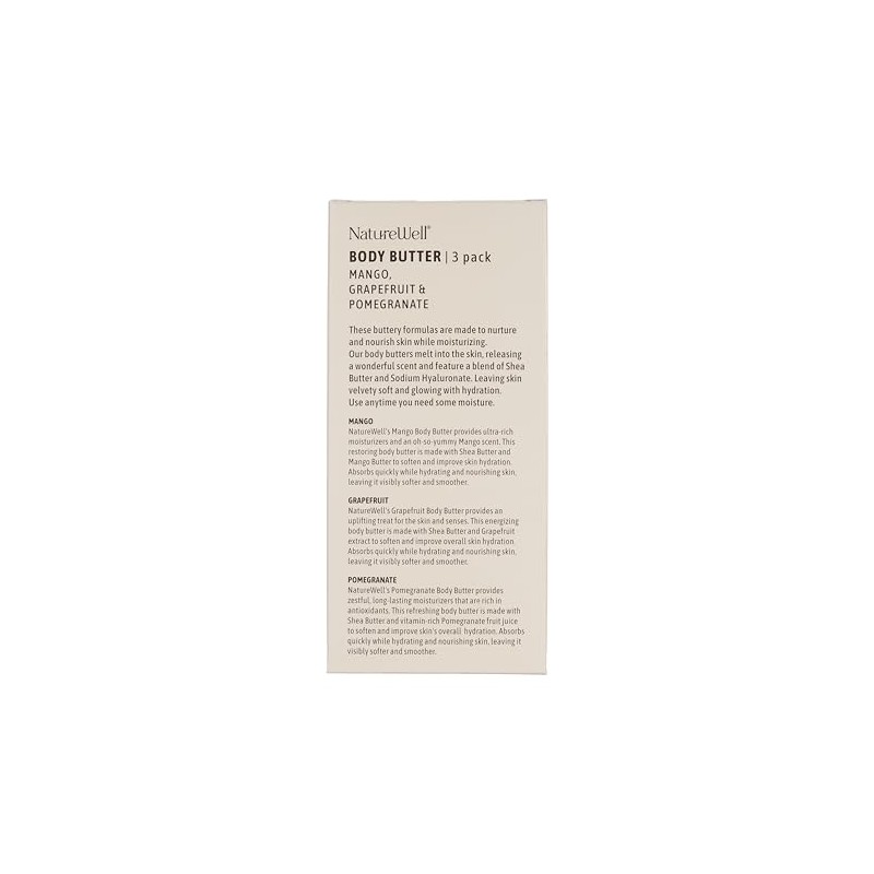 - Nutrient-Rich Formulation: NatureWell's Body Butter Trio is more than just a moisturizer C it's a nutrient-packed skin treatment. Infused with Vitamin E and natural fruit extracts, these body butters nourish the skin and help prevent dullness. Additionally, antioxidants promote a healthy, radiant glow. With consistent use, these body butters can help to improve skin hydration and enhance your skin's overall appearance for a naturally healthy-looking glow.
