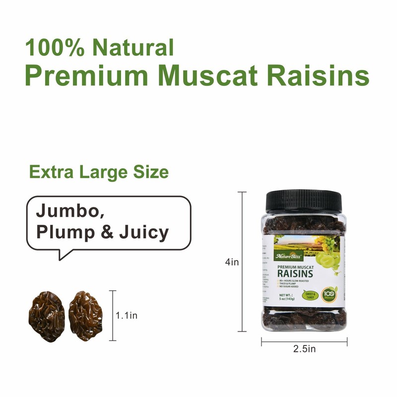 NatureBliss Muscat Raisins, Gluten-Free, Kosher, Non-GMO, Vegan, Dried Fruits, Naturally Sweet, No Added Sugar, Seedless,Fruity Topping & Inclusion, Ideal for Baking (Muscat Raisins - 5OZ)