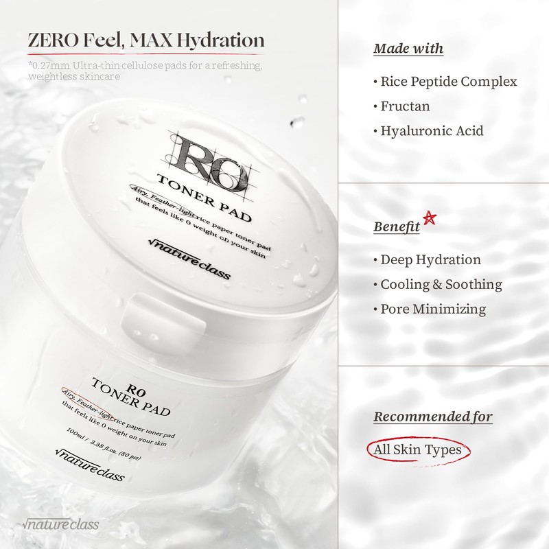[NATURECLASS] R0 Rice Toner Pads |Seamless Cellulose Gel | Zero Irritation Hydration | Rice-Peptide Complex for Soothing,Nourishing | Vegan & Biodegradable | Korean Skincare | 80 Pads
