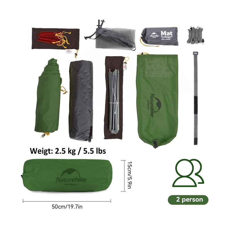 - 2 Person Backpacking Tent - The Naturehike Mongar 2 person tent weights only 5.3lbs for the whole set,including groundsheet(FREE); packing size: 19.7*φ5.9in, Packs down small with included carrying sack so you can carry it easily on backpacking trips