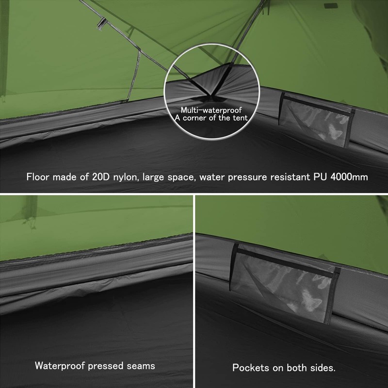 - Waterproof Backpacking Tent: Tent Fly: 210T polyester, waterproof 3000mm , Inner tent: B3 mesh, Bottom tent: 210T polyester, waterproof 3000mm; Poles: 7001 Aluminium alloy ,Tough and durable. High density B3 mesh provides good breathability and keeps insects from biting
