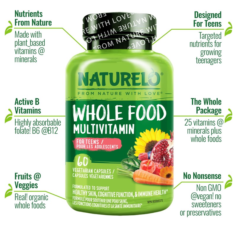 NATURELO NATURELO Whole Food Multivitamin for Teens - Natural Vitamins/Minerals for Teenage Boys & Girls - Supplement for Active Kids - with Organic Extracts - Non-GMO - Vegan/Vegetarian - 60 Capsules