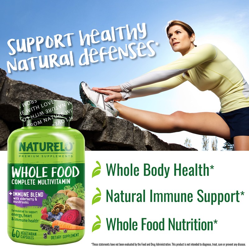 NATURELO Whole Food Multivitamin + Immune Blend with Elderberry & Mushrooms - Complete Multivitamin with Extra Immune Support - C, D3, Zinc, Elderberry, Reishi, Shitake - 60 Vegan Capsules