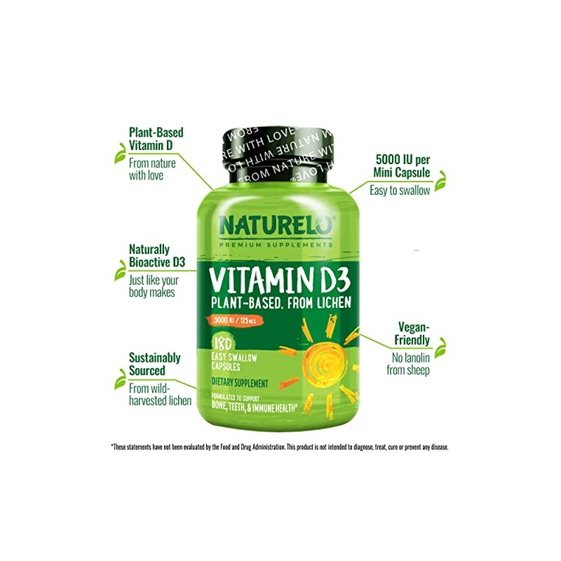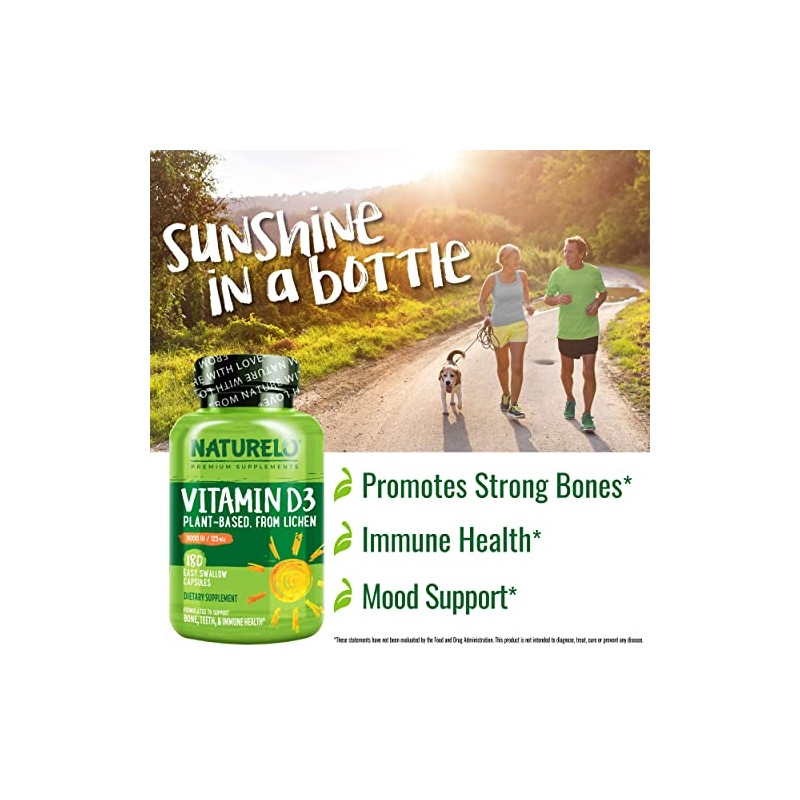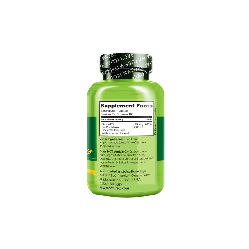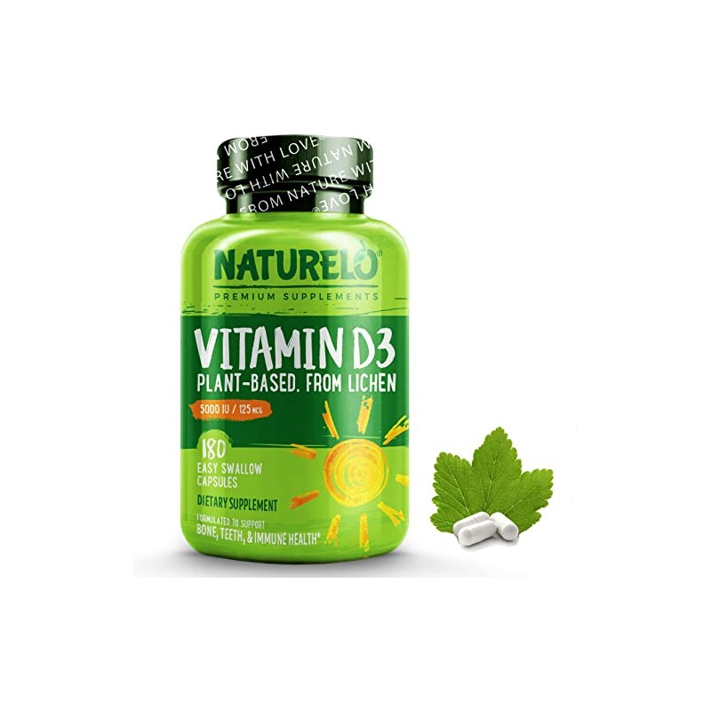 NATURELO Vitamin D - 5000 IU - Plant Based from Lichen - Natural D3 Supplement for Immune System, Bone Support, Joint Health - High Potency - Vegan - Non-GMO - Gluten Free - 180 Capsules