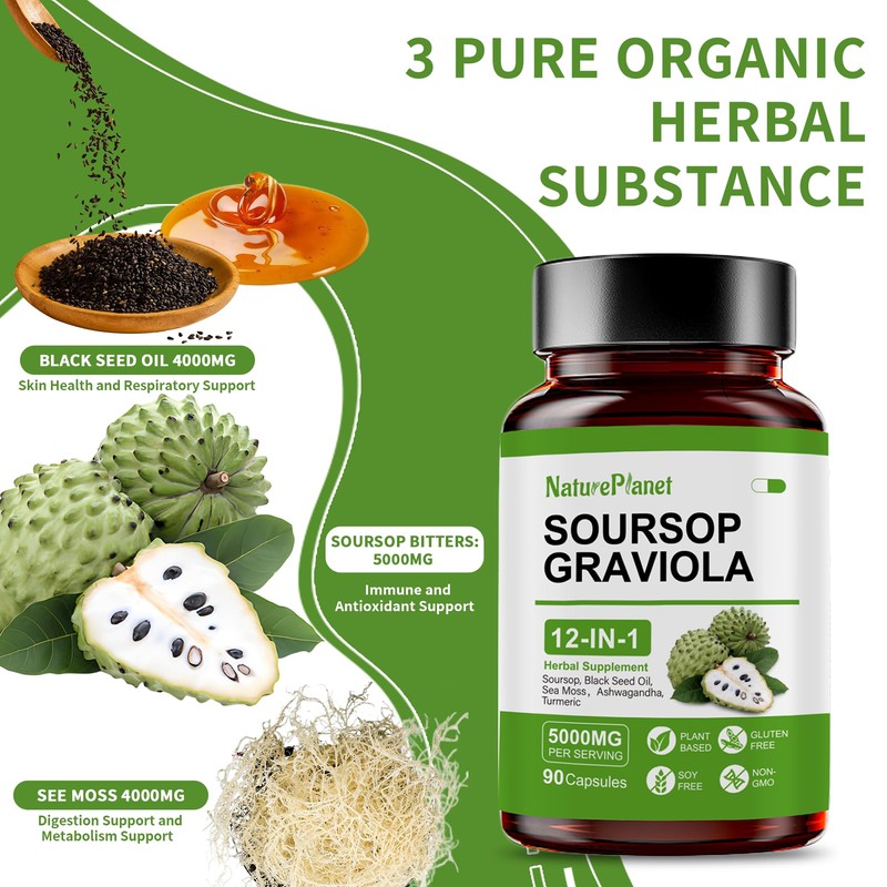 - Comprehensive Herbal Blend for WellnessNaturePlanet Soursop Graviola combines 12 potent herbs like Black Seed Oil, Sea Moss, and Ashwagandha in one formula. This rich blend supports overall wellness with essential nutrients, antioxidants, and plant extracts. Perfect for those seeking a natural, multi-ingredient supplement to enhance their daily health routine