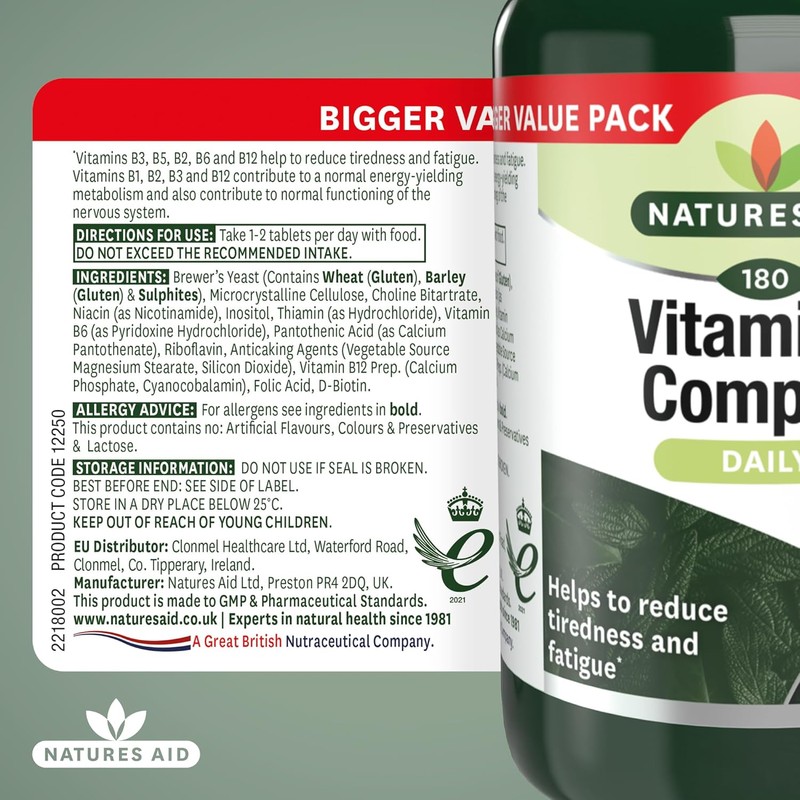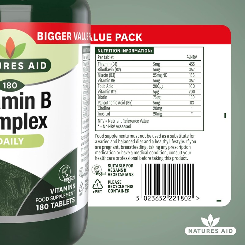 Natures Aid Vitamin B Complex 180 Tablets – High Potency – Supports Energy Metabolism, Nervous System, Brain & Immune Function – Vegan, Gluten Free, Non-GMO – Overall Wellbeing Supplement