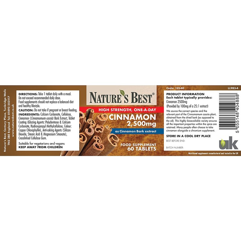 Food supplements should not replace a balanced diet and healthy lifestyle. - Formula: Typically per tabletCinnamon Bark2500mg(provided by 100mg of a 25:1 extract)