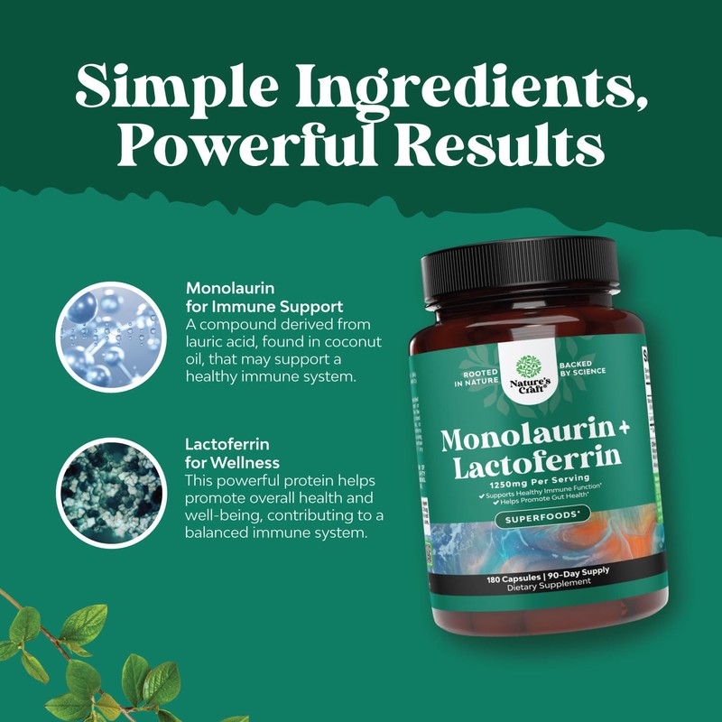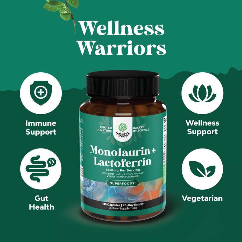 Natures Craft High Strength Lactoferrin & Monolaurin Supplement - Microbiome Digestive Health Immune Support Supplement - 250mg Lactoferrin and Monolaurin 1000mg Capsules - Vegetarian (90 Servings)