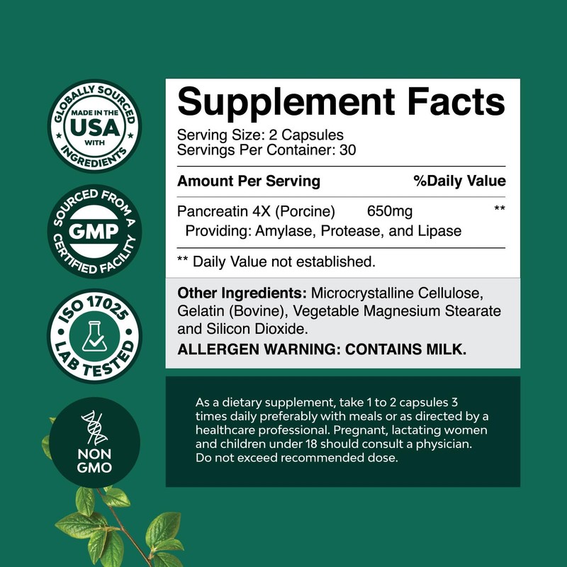 • Pancreatin 4X - This proven combination of pure digestive enzymes for pancreas support and digestive health helps break down the main building blocks of food to keep your body functioning at its best