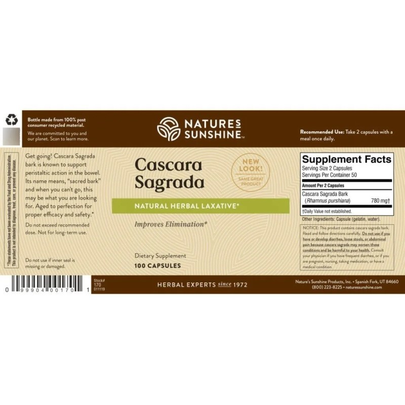 “Nature's Sunshine Cascara Sagrada 100 cápsulas”, “suplemento laxante herbal”, “corteza de cascara sagrada”, “salud intestinal natural”, “alivio del estreñimiento ocasional”.