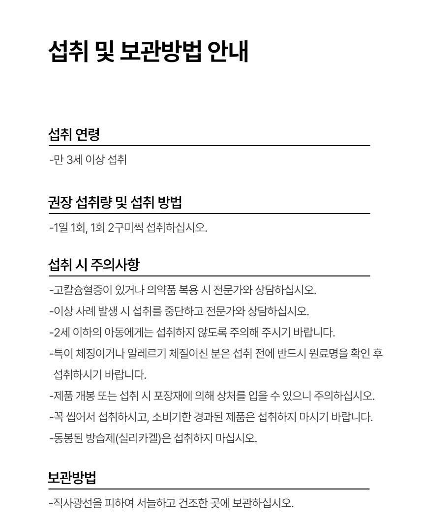 - safety precautions for consumers: Health functional foods are foods manufactured and processed using ingredients or components that have beneficial functionalities for the human body. Report abnormal cases to 1577-2488. This product can be exchanged or compensated based on the Consumer Dispute Resolution Standards announced by the Fair Trade Commission.
