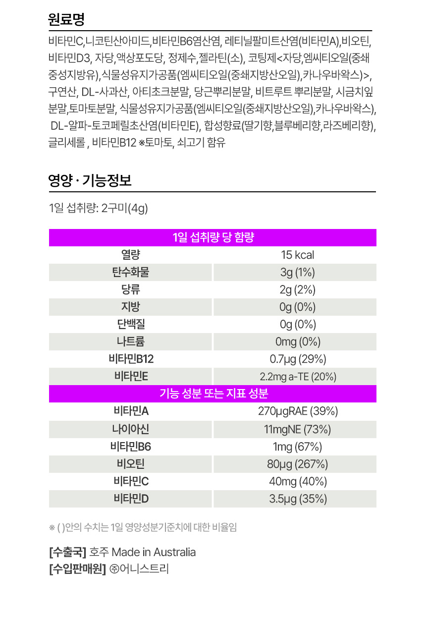 - nutritional information: Nutritional and functional information Daily intake: 2 gummies (4g) Per daily intake calorie: 15 kcal Carbohydrates: 3g (1%) Sugars: 2g (2%) Fat: 0g (0%) Protein: 0g (0%) Sodium: 0mg (0%) Vitamin B12: 0.7 g (29%) Vitamin E: 2.2mg -TE (20%)