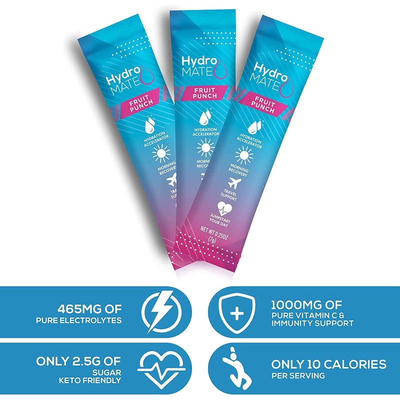 NatureWorks HydroMATE Electrolytes Powder Low Sugar - 16 Count Fruit Punch Instant Hydration Packets with Vitamin C to Boost Energy - Low Sugar Electrolytes Powder Packets to Support Hydration Fast Party Recovery