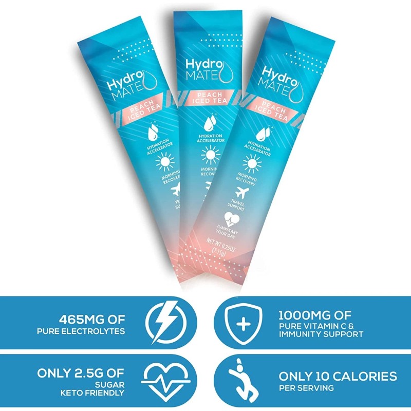 HydroMATE Electrolytes Powder Low Sugar - 16 Count Peach Tea Daily IV Instant Hydration Packets with Vitamin C to Boost Energy - Low Sugar Electrolytes Powder Packets to Support Hydration Recovery