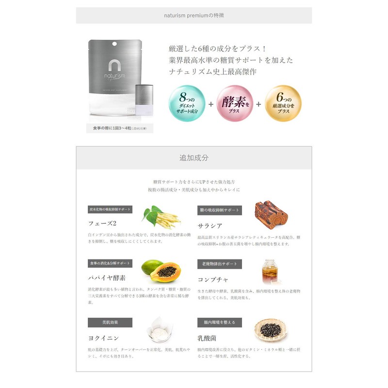 酵素 in ナチュリズムをベースに、新たに6成分をプラスした強化処方! 成分を増やした分、1日9粒設計(1回3~4粒)になりました。 <追加成分> ①フェーズ2②サラシア③パパイヤ酵素 ④コンブチャ⑤ヨクイニン(ハトムギ) ⑥乳酸菌
