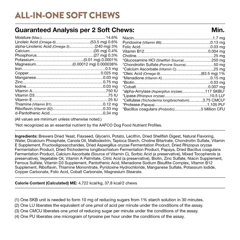 - HIGH-QUALITY HEALTH SUPPLEMENT FOR DOGS: Give your pet the nutritional support that provides four different health benefits. All-In-One provides support for hip & joints, skin & coat, digestive enzymes & probiotics, and finally the multi vitamins and minerals essential to overall health and well-being.