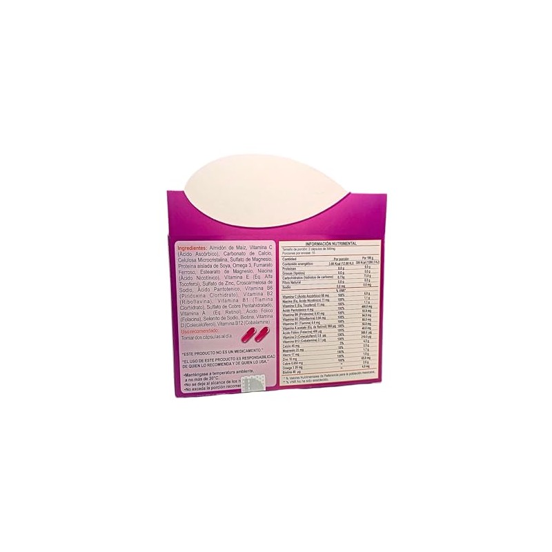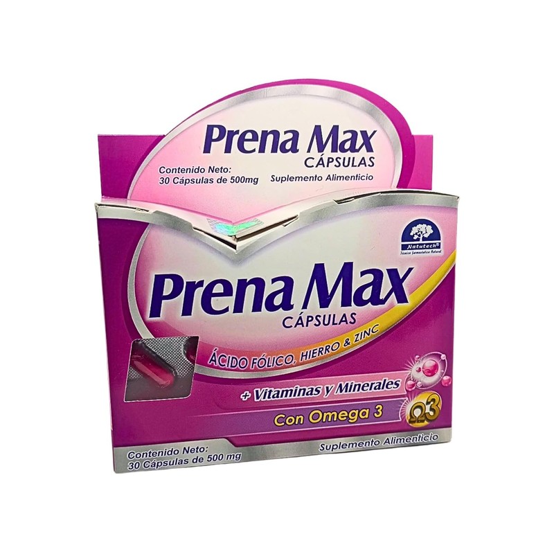 - 3 en mujeres en edad reproductiva que están intentando embarazarse, embarazadas y durante la lactancia. Nuestra fórmula especial proporciona una protección vital contra los defectos del tubo neural en el feto y actúa como profilaxis para prevenir la anemia por deficiencia de hierro y ácido fólico durante el embarazo. Con Prena Max, brindamos un respaldo nutricional completo para cada etapa importante del proceso reproductivo. Beneficios Destacados: Cubre las necesidades nutricionales incrementadas durante la concepción, el embarazo y la lactancia. Protege contra los defectos del tubo neural en el feto. Previene la anemia por deficiencia de hierro y ácido fólico durante el embarazo. Presentación: Cada caja contiene 30 cápsulas para un suministro conveniente y completo. Instrucciones de Uso: Tomar 2 cápsulas al día
