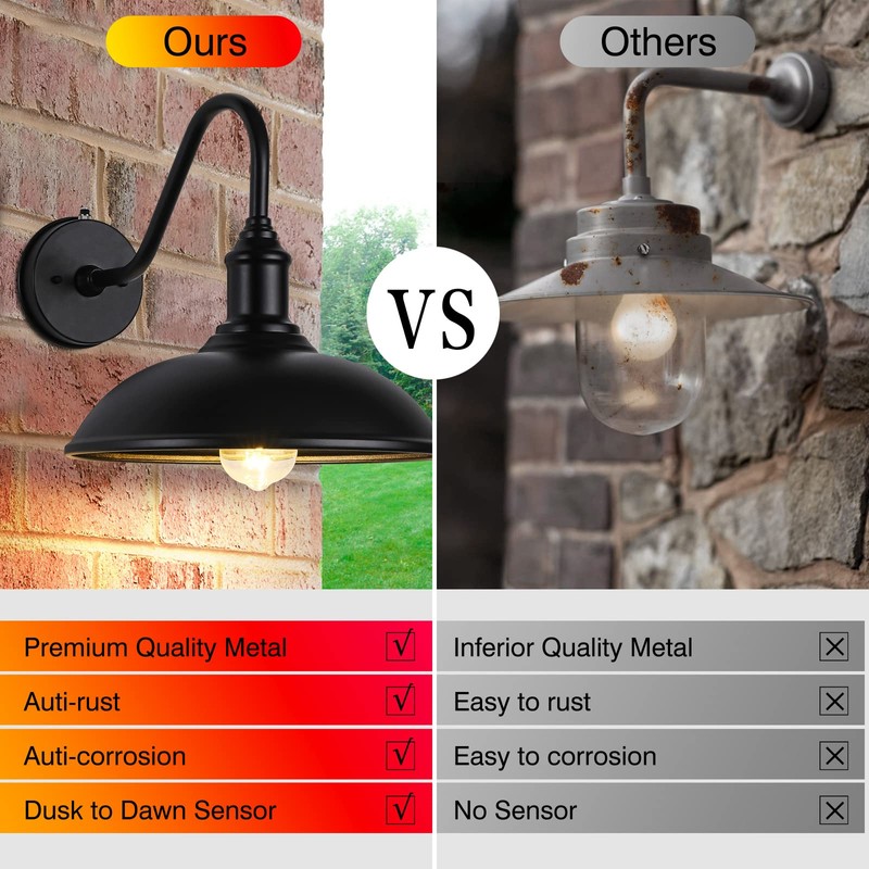 - Barn Lights Exterior Dusk to Dawn Sensor -- Auto sensing with hands-free to turn off at daytime and turn on at night, sconces farmhouse lighting fixtures with photocell control can help you to save energy.