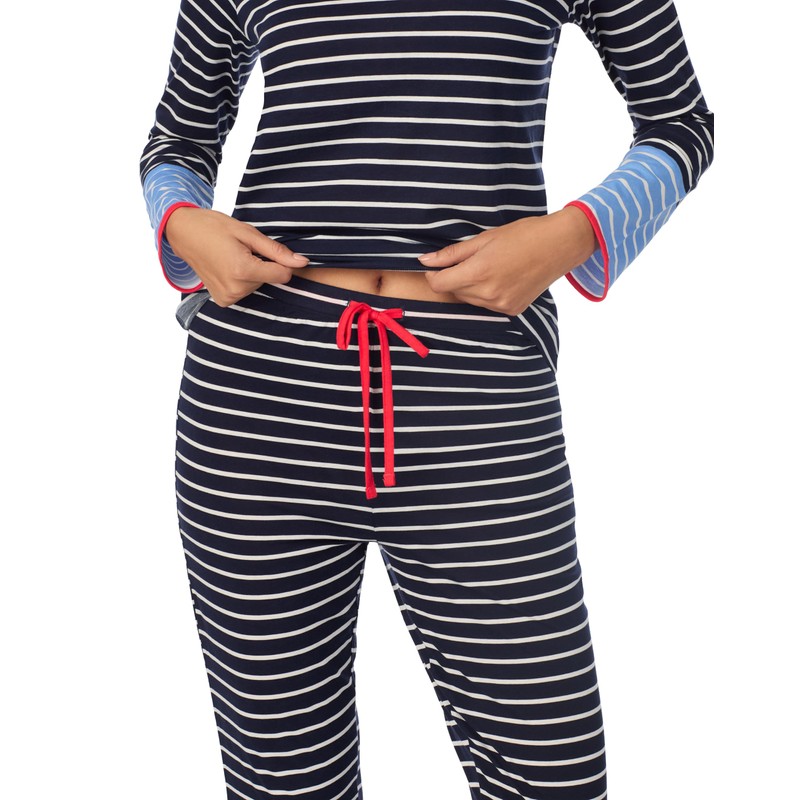 Nautica 2-Piece Crew Neck Pajama Set, Long Sleeve Top & Jogger Pants with Drawstring for Women, Lightweight Cotton Blend, Navy Stripe, Medium