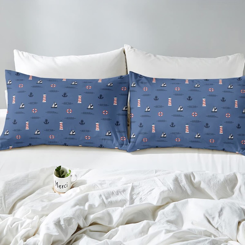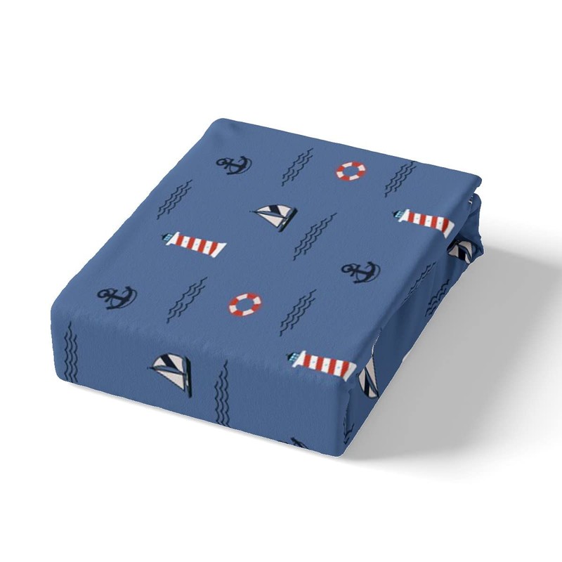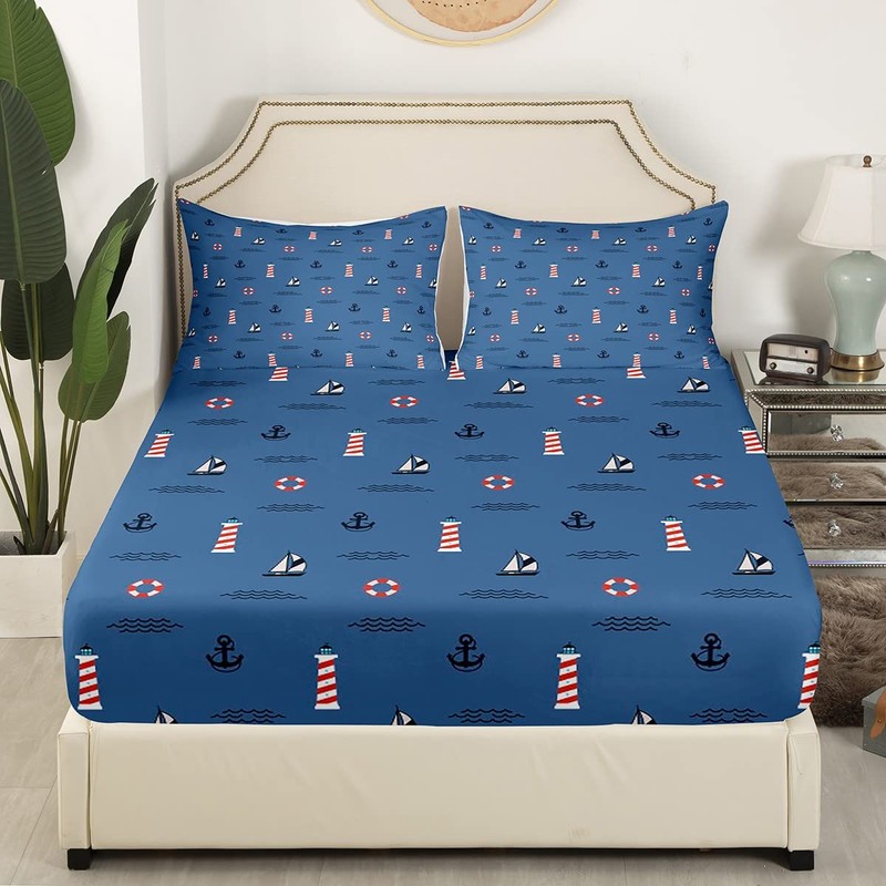 Nautical Bed Sheet Set Queen Size Ocean Anchor Decor Fitted Sheet for Kids Decor Sea Lighthouse Bedding Set Microfiber Marine Sailboat Bed Cover Deep Pocket Bedroom Blue Bed Set