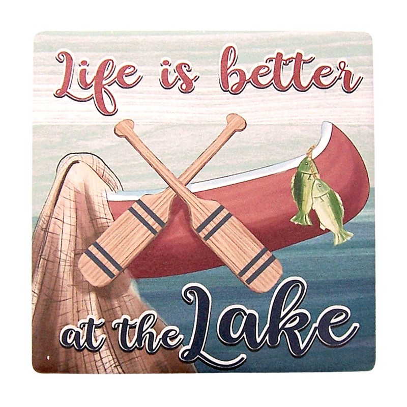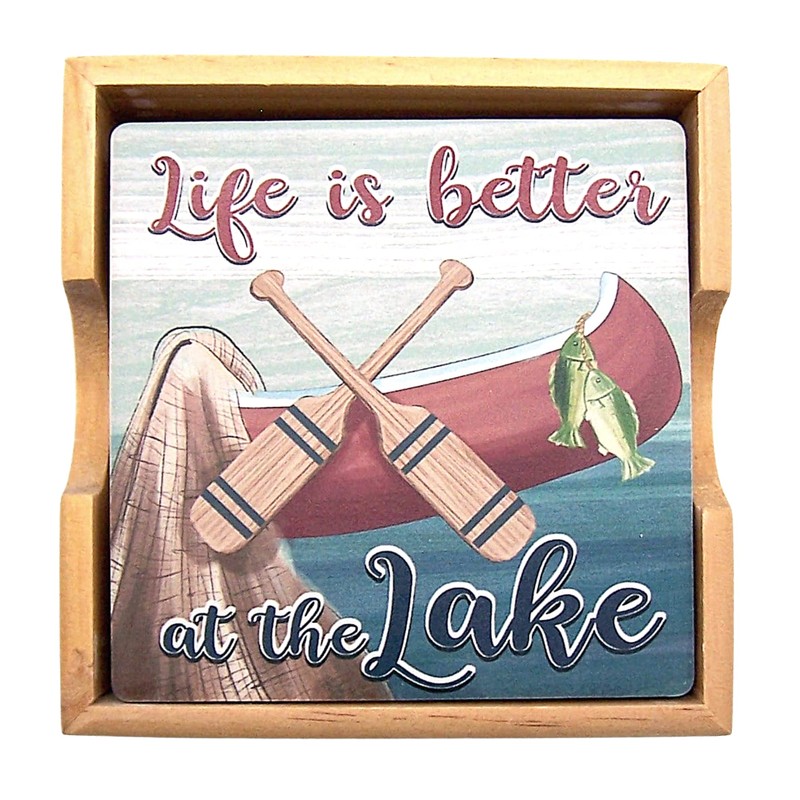 - Coaster Set Featuring a Fishing Boat and Reading 'Life is Better at the Lake' with a Square Wooden Holder
