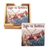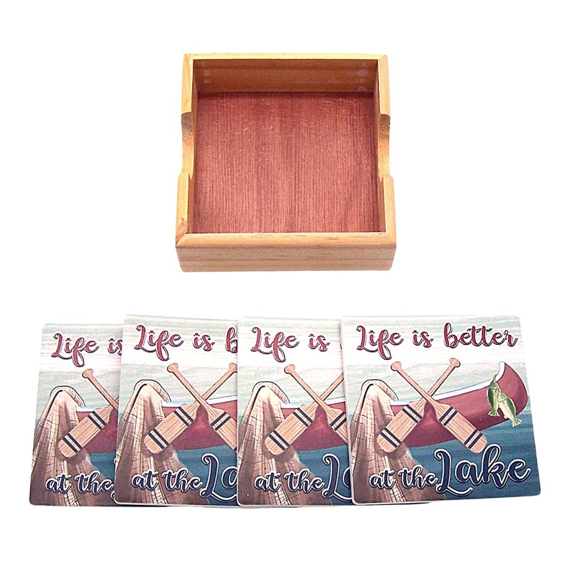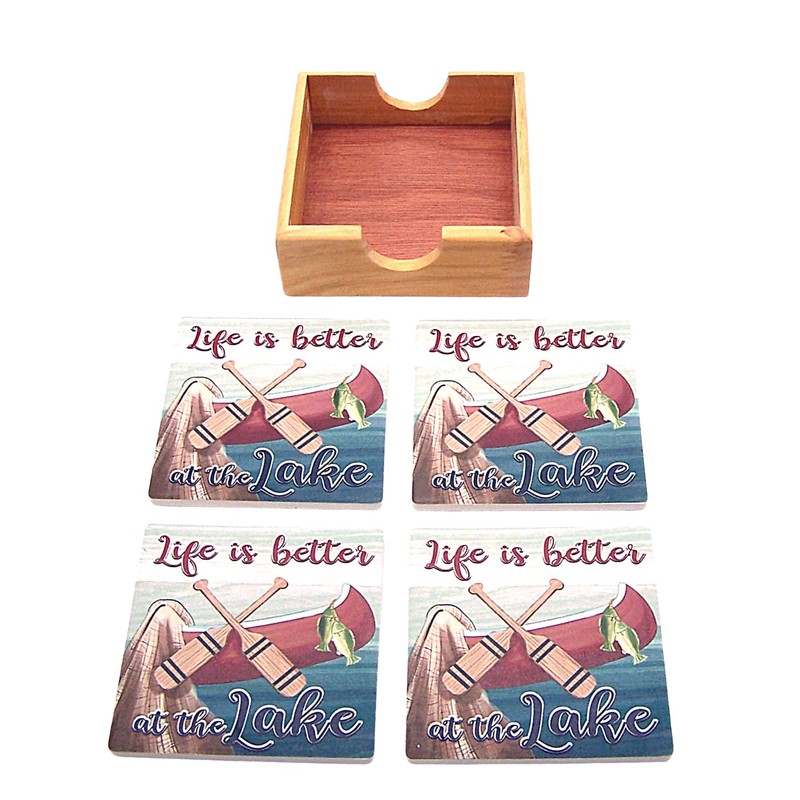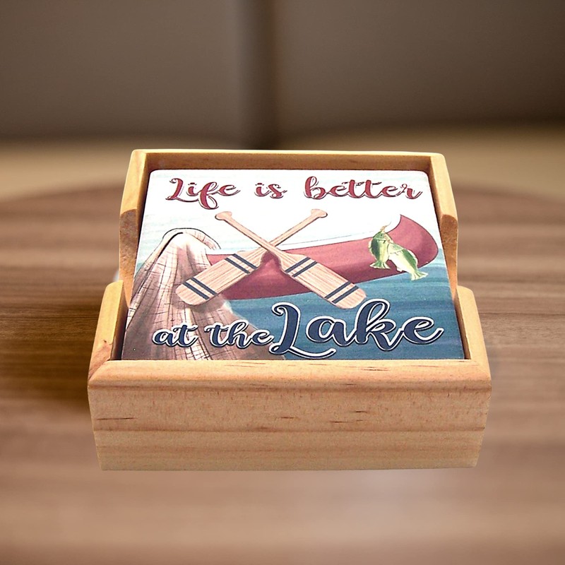 Nautical Decor- Life is Better at The Lake Coaster Set with Wooden Coaster Holder, Set of 4 Coasters, 4.25 Inches