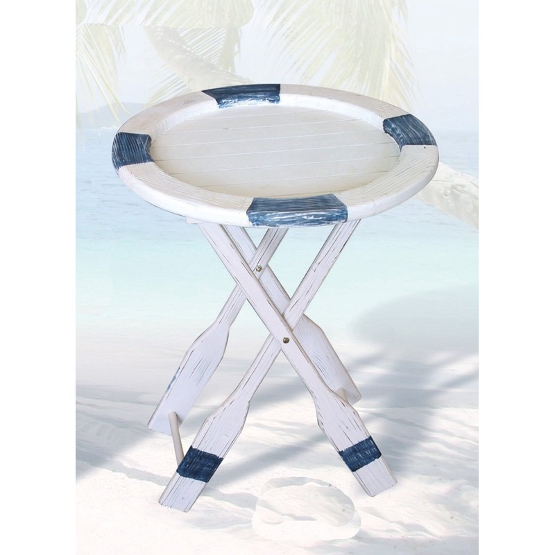 - The life ring table features a distressed white & blue life ring sitting atop a stand made to look like oars.