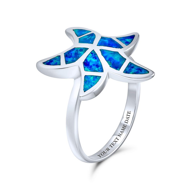 - This inlay-ed synthetic blue opal starfish ring is 19mm of oceanic fun. This sterling silver sea stars is the perfect addition to your jewelry box.