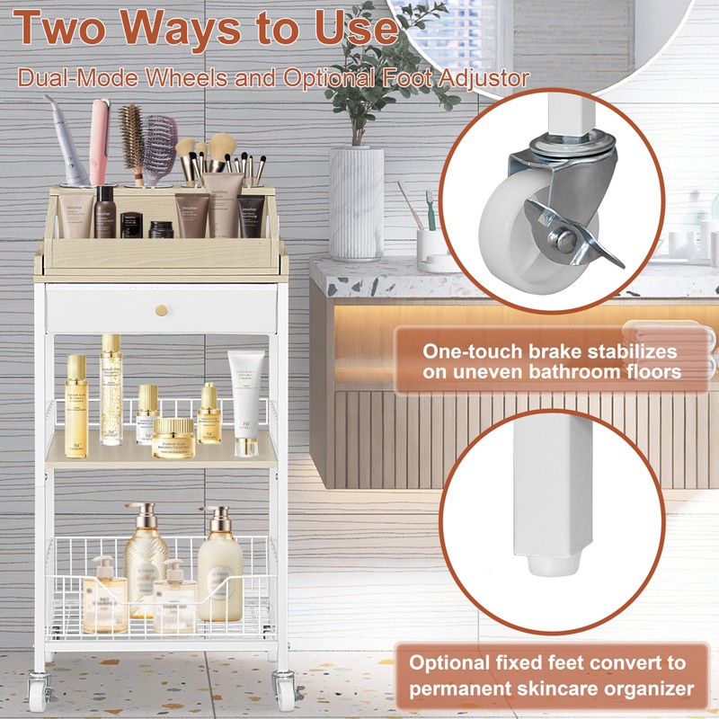 - 【Smart Dual-Mode Wheels and Optional Foot Adjustor】The makeup organizer for vanity has 2 lockable casters to stabilize the makeup cart on uneven floors (perfect for bathtub edges!), while 360° silent rollers glide easily across tiles – switch modes in 2 seconds with toe taps. OR if you want to use this Vanity storage cart without movement, you can choose to replace the wheels with foot adjustors included in the box