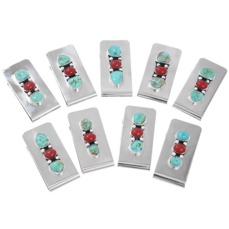 Navajo Turquoise Coral Silver Money Clip Three Gemstone Design on Silver Clamp 0200