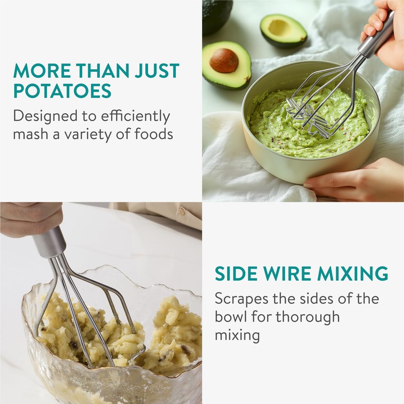 - SCRAPES WHILE YOU MASH: Equipped with a side wire, this masher kitchen tool not only mashes your food but also scrapes the sides of bowls and pots. This ensures less waste and more even mixing.