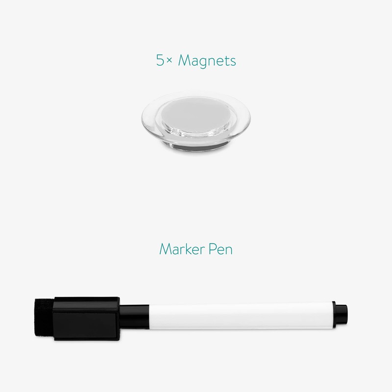 - INCLUDES: Magnetic whiteboard made of MDF frame, coated paper, and bagasse board. Comes with 5 magnets and 1 marker with magnetic cap. Hanger hooks are preinstalled for easy mounting.