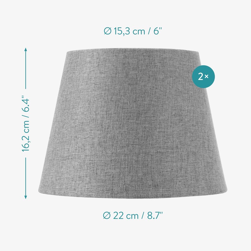- DETAILS: 2x Lampenschirm / Fassung: E27 / H?he: 16,2 cm / Durchmesser: 22 cm unten; 15,3 cm oben / Material: Leinen, Kunststoff / Gewicht: 175 g / Farbe: Grau & Gold