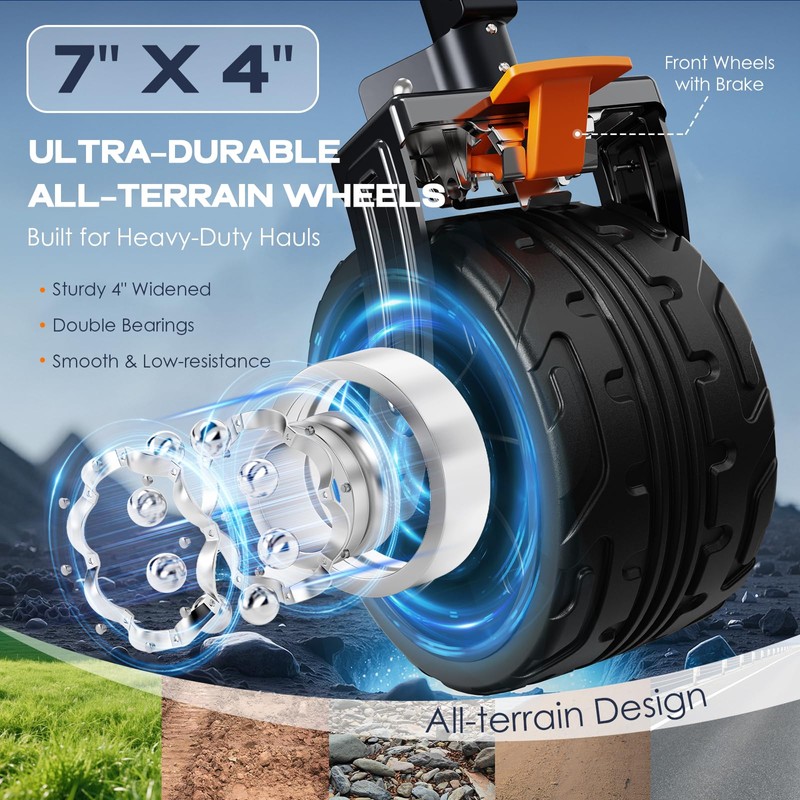 • LOCKING BRAKE DESIGN : The front wheels are equipped with brakes, which locks both the wheels and direction simultaneously effectively to stop and prevent the wagon from moving. Navatiee collapsible wagon features four 7*4 PVC all-terrain wheels built to handle hard sand, grass, and all kinds of complex ground. It features strong abrasion resistance, silent shock absorbance, wear proof, no drag marks and enhances the impact resistance of the wheels.