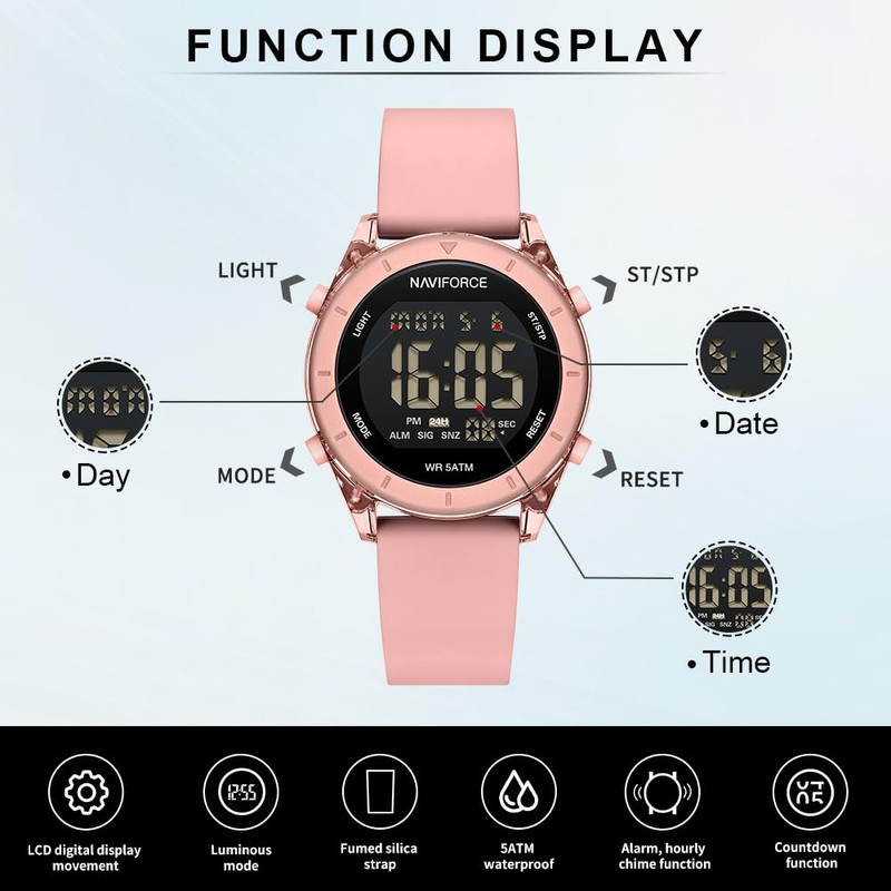 NAVIFORCE Digital Sport Waterproof Watches with Stopwatch, Alarm, 12/24 Hours, Hourly Time Signal and Snooze Function, Silicone Strap Wristwatch for Women