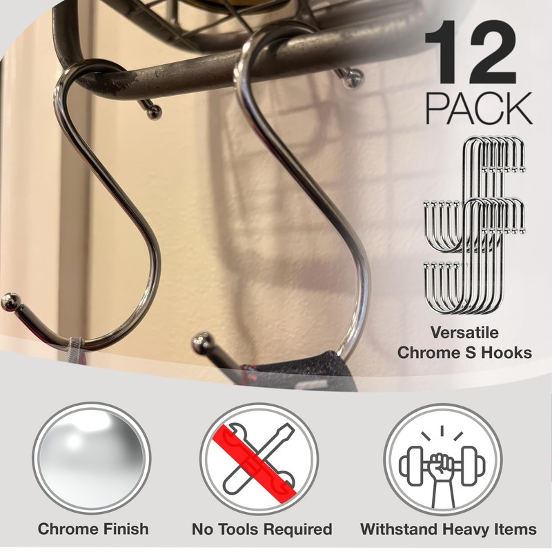 Navoys 12pc S-Shaped Hanging Hooks – Slim Rail Chrome Hook Hangers for Home Organisation – Durable Storage Solution for Kitchen, Closet, Bathroom, and Garage – Space-Saving & Versatile