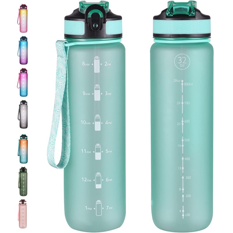 Navtue 1L Water Bottle with Straw,Sports Drinks Bottle with Time Markings, Leak Proof, Tritan BPA Free for School/Cycling/Running Mint Green