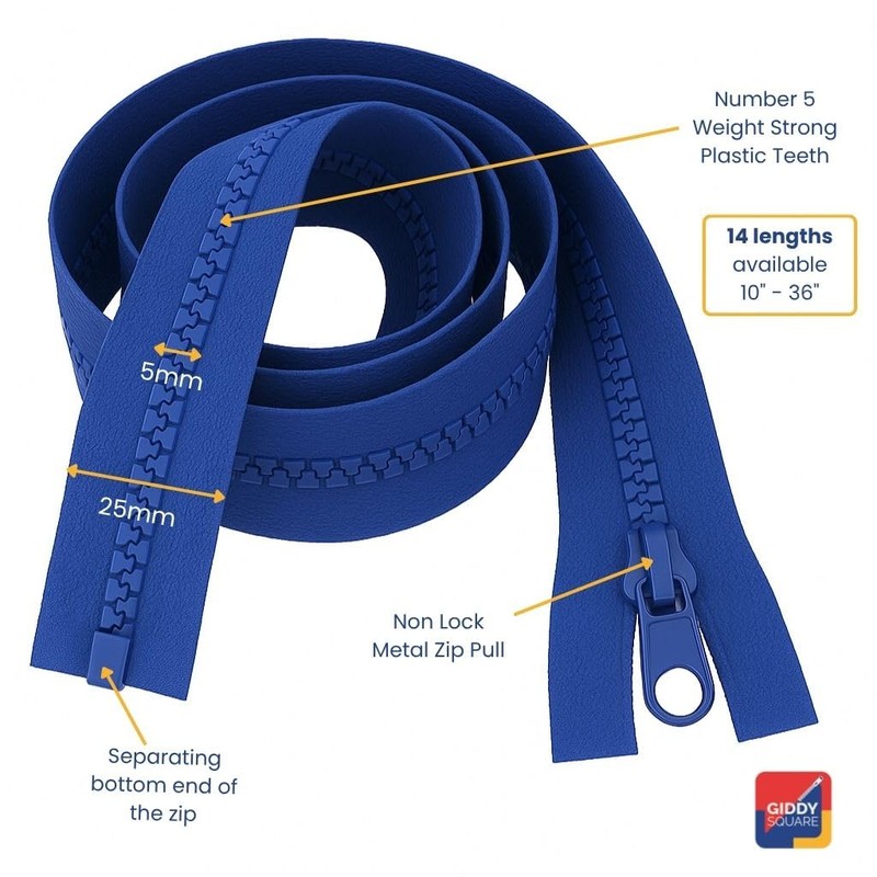 - Heavy-duty separating zip with strong #5 plastic teeth for ease of use in sewing.
