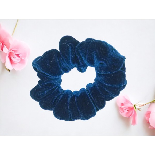 Stunning, soft and comfortable navy blue stretch velvet hair scrunchies. You'll want several of these versatile scrunchies. This scrunchy is available in six sizes Regular, Small, Large, Full, Jumbo and Twiggy. Machine wash in cold water and tumble dry low. The nap on velvet clings to your hair just the right amount and does not slip during the day