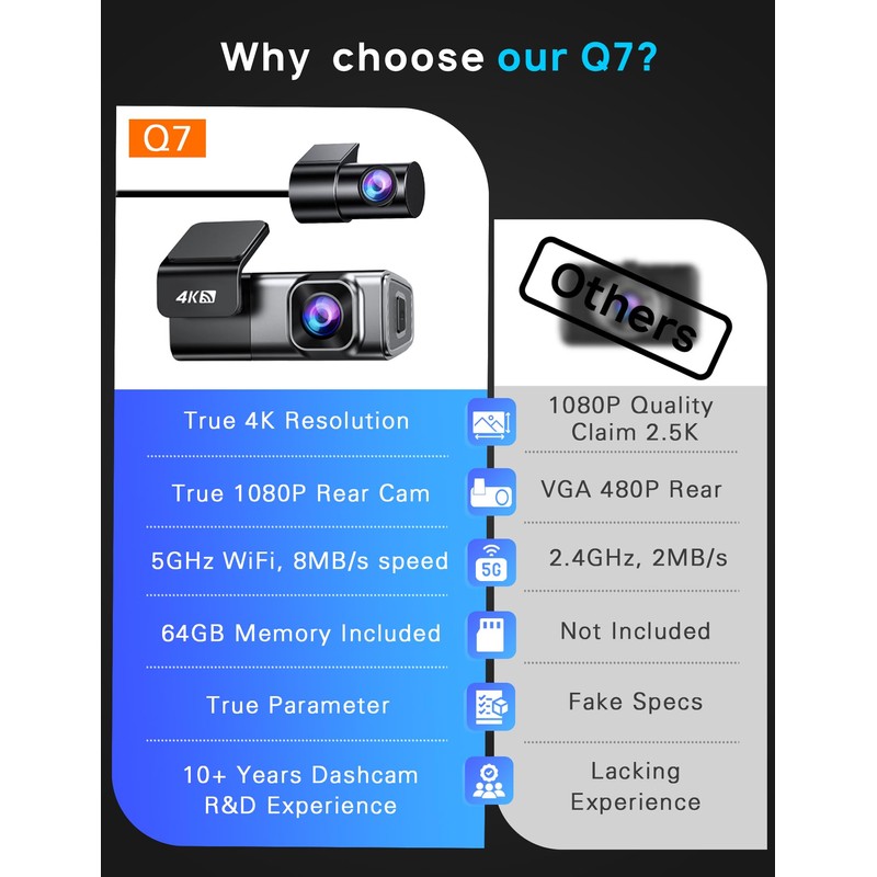 - 【5G WiFi Dash Camera for Cars & App Control】Equiped with cutting edge 5G WiFi module, allow 4x download speed(up to 8 MB/s) compared to other 2.4G. Easily connect to our Q7 dash camera for cars, you can instantly view the live time video from the front and rear side of your car, and adjust the settings of the Q7 car camera. With a few simple taps, you can download the albums from the app, edit them, and share them on social media.